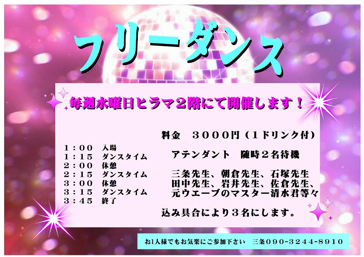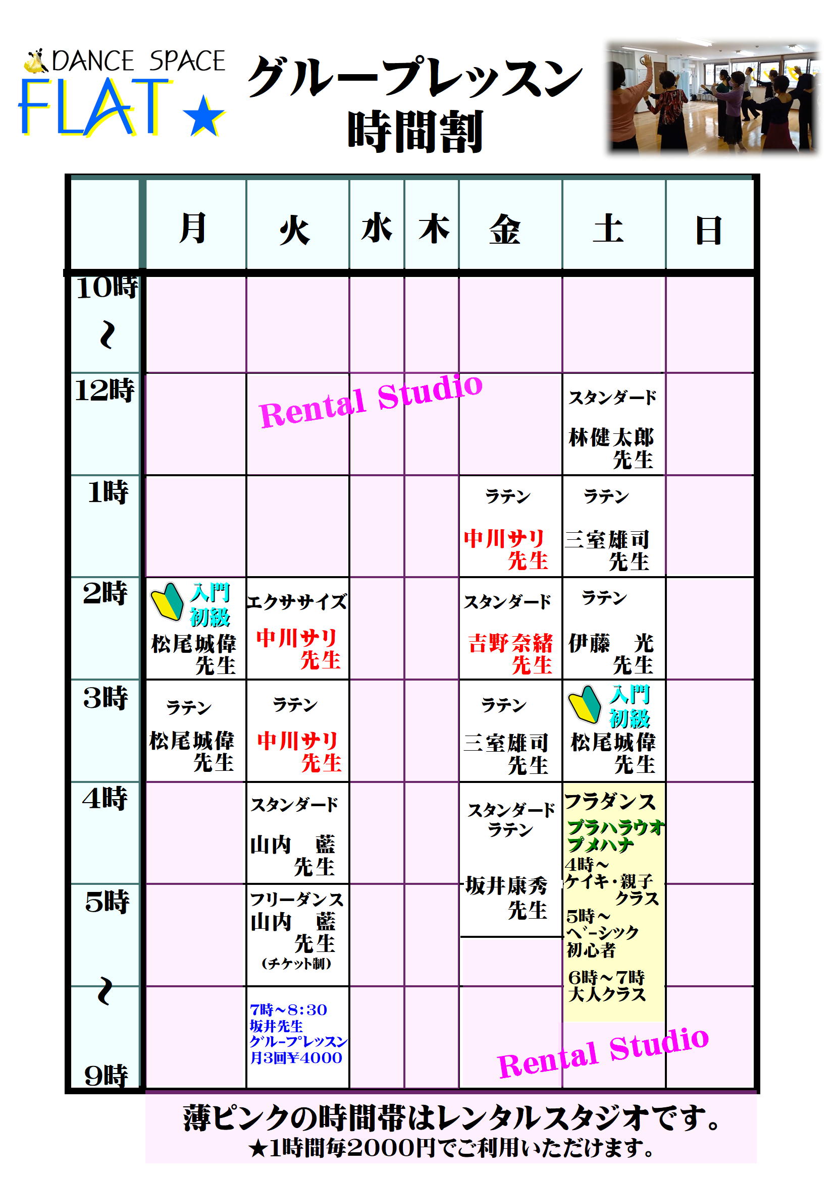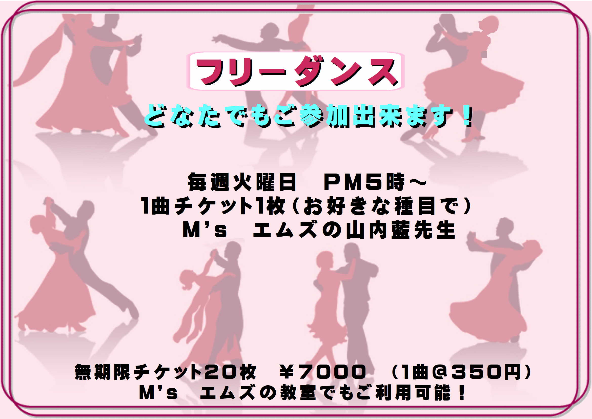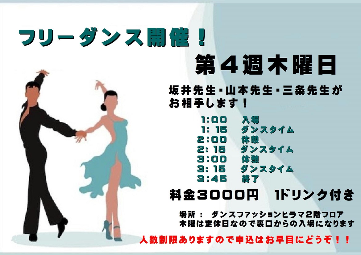 練習場利用上のご案内 ●受講料は直接先生にレッスン前にお渡し下さい。 ●トイレ・更衣室(2ヶ所)は2階フロア左奥にあります。 ●ダンスシューズをお履きいただき、女性はヒールカバーをお願いします。 ●本格的な飲食はご遠慮下さい。